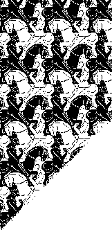 上の版画の一部を(ちょっとだけ細工をしつつ)抜き出してみたのが下の画像だが、白黒半分づつのニ値画像であることがわかるだろう。また、きれいな繰り返しパターンになっていて、平面にこのパターンできれいに埋め尽くすことができるのがわかるだろう。