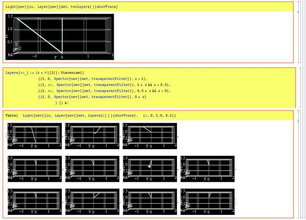 以前作った、「分光スペクトル・色処理用のMathematicaライブラリ(関数群)」を利用して、「Mathematicaで発色シミュレーションをオブジェクト風記述にするライブラリ」を作りました。前回書いたように、三次元構造の中で反射・屈折・散乱を行う「光」のスペクトルが、どのように変化していったかを知ることができます。
