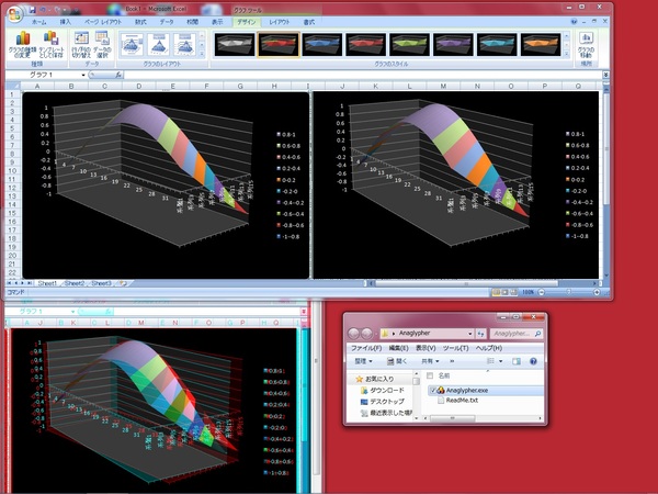 そこで、今日は同じデータに対して異なる視点から描画した2つのグラフを並べたMicrosoft Excelのウィンドウを、前回作ったソフトウェアで強引にアナグリフ立体画像にしてみることにしました。そのようすが、下(と右上)のスクリーンショットになります。